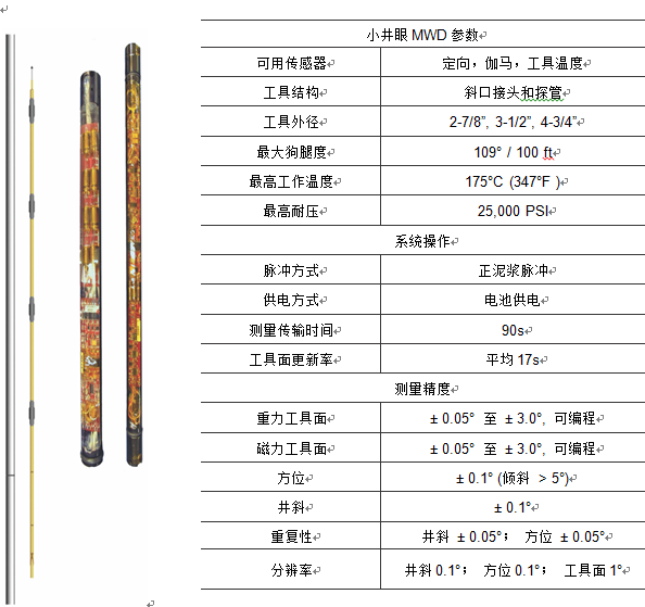小井眼MWD无线随钻测斜仪可以为多种类型的小井眼钻井提供定向和伽马射线服务,提供传统MWD无法达到的造斜率。适用于有小生产管柱井眼的加深钻进。